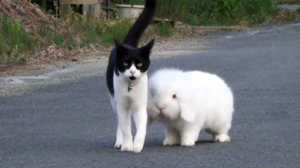 Coelho e gatinho fazem linda amizade e passeiam junto pelas ruas